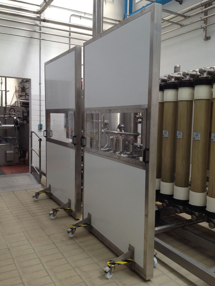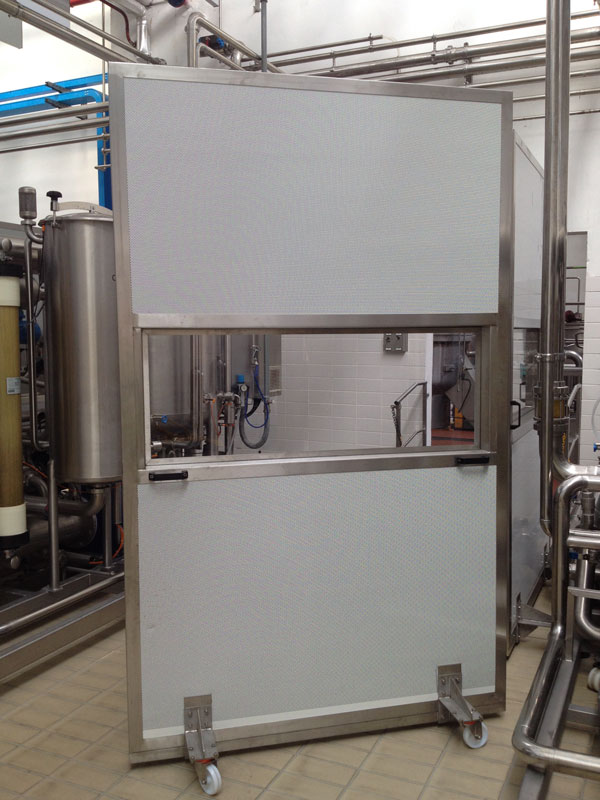 Le schermature fonoisolanti mobili di Matis, sono costituite da un telaio in profili metallici di acciaio inox AISI 304 contenente i pannelli antirumore, poggiato su di una base montata su ruote pivottanti provviste di freno.